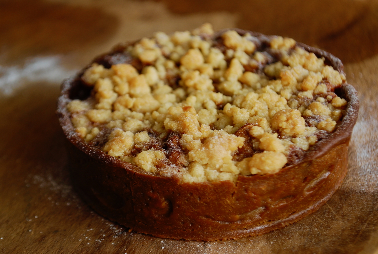 コーヒー味のタルトにキャラメルコーヒーのフィリングと胡桃を詰めてクランブルをかけました。濃い味ですがナッツの美味しさも味わえるパリのカフェの定番です。